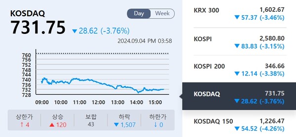 코스닥 지수는 3.76% 하락한 731.75포인트로 마감했다.