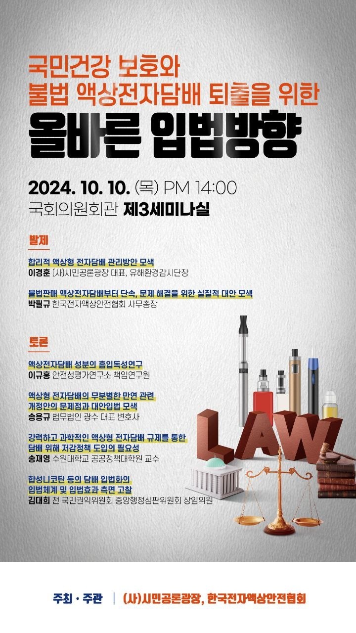 시민공론광장과 한국전자액상안전협회가 10일 오후 2시, 국회세미나실에서 '국민건강 보호와 불법액상 전자담배 퇴출을 위한 올바른 입법방향'이라는 주제로 토론회를 개최했다. 토론회에서는 '액상형 전자담배 업계 불법 실태'및 '국회에 발의된 담배사업법 개정안'과 관련해 치열한 논의가 있었다.