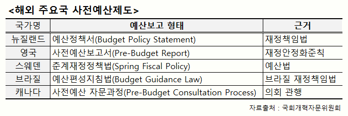 영국·뉴질랜드·캐나다·스웨덴·브라질 등 선진국에서는 1990~2000년대에 사전 예산제도를 도입했다.