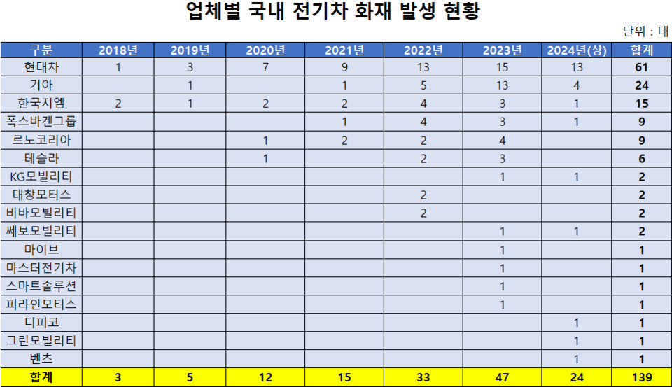 브랜드별 화재 발생 건수는 현대차가 61대로 가장 많았다. 이어 기아(24대), 한국지엠(15대), 폭스바겐그룹(9대), 르노코리아(9대), 테슬라(6대), KG모빌리티(2대) 순이다. 메르세데스-벤츠는 1대로 비교적 적은 수치를 보였는데, 이번 집계에는 지난 8월 발생한 청라 전기차 화재 사건은 포함되지 않았다.