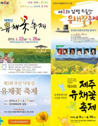 ‘지방재정 365’자료에 따르면 유채꽃 축제가 인기를 끌자, 전국에서 지자체의 지원을 받는 유채꽃축제라는 이름을 가진 축제는 무려 13개에 달한다. 매년 제주, 서귀포, 부산, 창녕, 양산, 남해, 태백, 경주, 나주, 삼척, 수원, 구리, 서울에서 열린다.