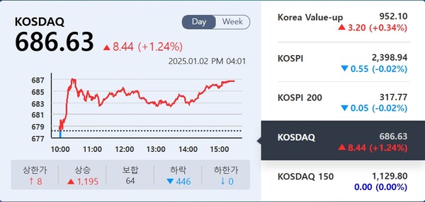 코스닥 지수는 새해 산뜻한 출발을 알렸다. 전 거래일 대비 0.86% 상승한 684.05 포인트로 거래를 마쳤다.