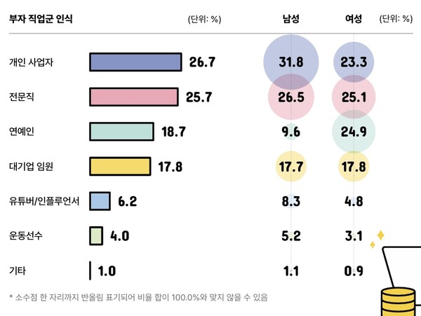 부자가 많은 직업군에 대해서는 개인 사업자나 전문직이 상위권을 차지했다. 남학생은 여학생에 비해 개인 사업자를 고소득 직업군으로 생각했지만 여학생은 연예인 직군을 높은 소득을 얻는 직업으로 생각했다.