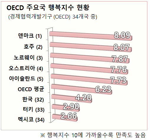 사회보장 지출비중이 많다는 것은 국민들에게 많은 혜택이 주어진다는 뜻이다. 세금을 더 많이 내는 덴마크가 우리나라 국민들보다 살기 좋다고 느끼는 것은 당연하다.