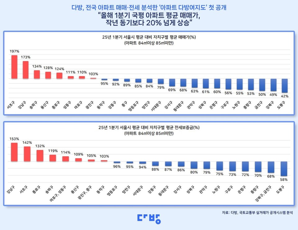 다방에 따르면 서울의 전용면적 84㎡ 이상~85㎡ 이하 아파트 평균 매매가는 14억5981만원, 평균 전세 보증금은 6억5292만원으로 각각 나타났다. 작년 동기 대비 매매가는 25.5%, 전세금은 2.3% 상승했다. 서초구 '국민평형'의 평균 매매가가 28억874만원으로 가장 높았다. 이어 강남구 173%, 송파구 134%, 용산구 128%, 종로구 124%, 성동구 111%, 마포구 110%, 광진구 103% 순이었다. 전세금의 경우 강남구가 9억9590만원으로 가장 높았다. 서초구 142%, 종로구 132%, 송파구 119%, 마포·성동구 114%, 용산구 109%, 광진·중구 105%, 동작구 103% 순으로 뒤이었다. 같은 기간 전국 84㎡ 아파트의 평균 매매가는 전년 동기 대비 27.7% 오른 5억7975만원으로 나타났다. 평균 전세보증금은 1.3% 오른 3억6727만원이었다.