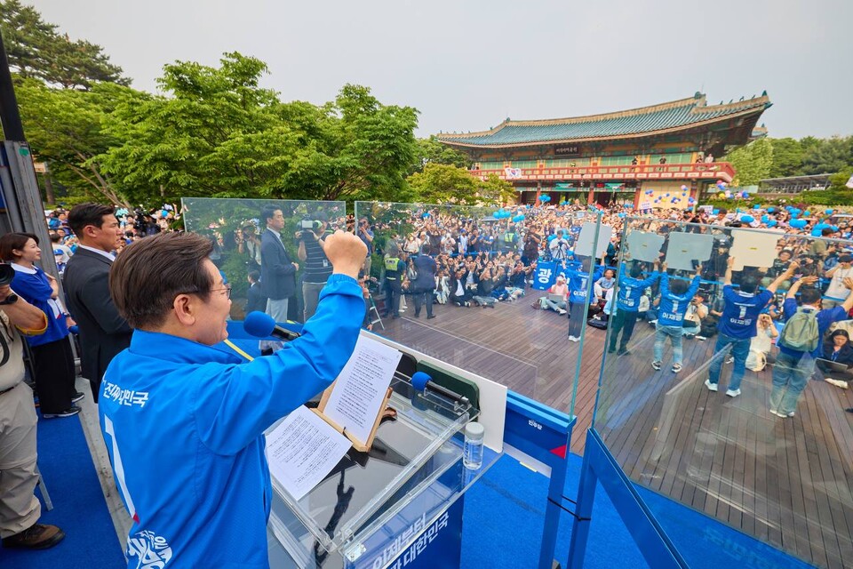 지난주 '윤석열 리스크' 전면 공세에 이어 이번 주에는 ▲내란 주범 규정 ▲경제 위기 진단 ▲유세 현장 참여 호소를 집중적으로 내세우며 '막판 불꽃 유세'에 속도를 높이는 모양새다. 이 후보는 "이번 선거는 내란 세력을 막고 헌정질서를 회복하는 선거"라며 연일 투표 참여를 촉구했다.