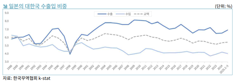 반면, 2000년 이후에는 반도체, 석유제품, 철강 등 주력 산업 중간재를 중심으로 양국간 교역이 늘어나 수평적 협력관계가 강화된 것이 특징이라고 분석했다. 한일 산업내 교역 지수는 1988년 0.25에서 2024년 0.42로 상승했으며, 이는 양국이 주력 산업의 성장 과정에서 상호 보완적으로 중간재 교역을 확대해 온 결과로 풀이된다.