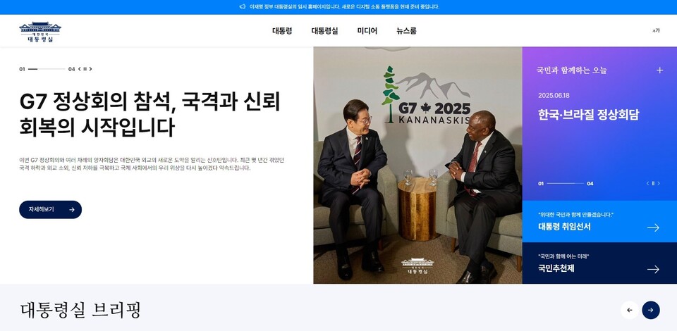 대통령실은 "이번 임시 홈페이지는 국민에게 필요한 정보를 빠르고 정확하게 제공하는 데 중점을 두고 있다"면서 "빠른 시일 내 정식 홈페이지를 구축해 국민 참여 기능과 디지털 소통 채널을 한층 강화해 나갈 예정"이라고 밝혔다.
