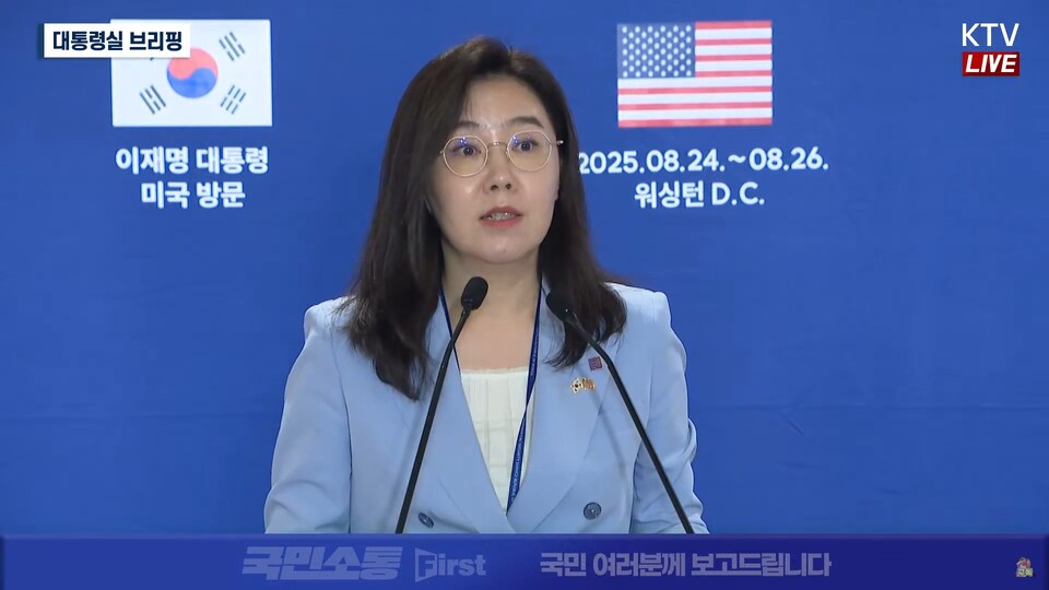 강유정 대통령실 대변인은 이날 오후 미국 워싱턴DC 한 호텔에 마련된 한국프레스센터에서 연 브리핑에서 "오늘 이 대통령은 트럼프 대통령과 당초 예상보다 긴 정상회담을 가졌다"며 이같이 밝혔다.