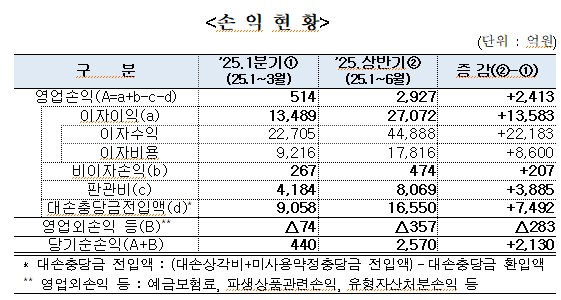 29일 올해 2분기 저축은행 업권의 누적 당기순이익은 2570억원으로 2개 분기 연속 흑자를 달성했다. 부실채권 정리와 선제적 대손충당금 적립으로 대손충당금 전입액이 9000억원에서 7000억원으로 줄어든 것이 수익성 개선을 이끌었다.