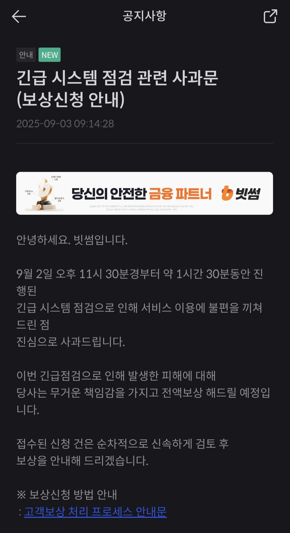 3일 빗썸은 간밤 긴급 점검으로 발생한 전산 장애에 대한 사과문과 함께 피해 보상 절차를 안내했다.