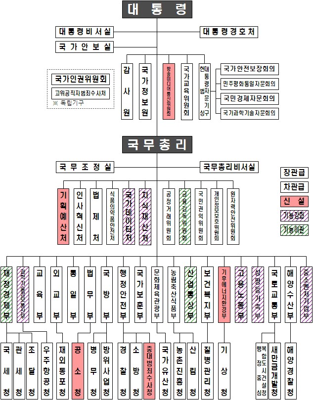 조직개편 방안에 따르면 중앙행정기관은 기존 '19부 3처 20청 6위원회' 등 총 48개 기관에서 '19부 6처 19청 6위원회' 총 50개 기관으로 변동될 예정이다.