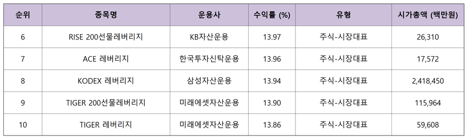 KB자산운용의 'RISE 200선물레버리지'는 13.97%, 한국투자신탁운용의 'ACE 레버리지' 역시 13.96%를 기록했다.