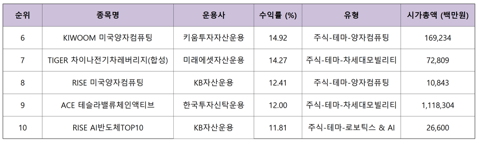 한편 상위 10개 ETF 가운데 양자컴퓨팅 ETF가 절반(5종)을 차지하며 테마 집중도가 높았다. 운용사별로는 미래에셋자산운용과 KB자산운용이 각각 2종, 신한·한화·삼성액티브·키움·한국투자신탁이 1종씩 나눠 가졌다.