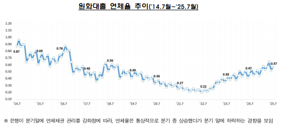 26일 금융감독원에 따르면 7월 말 국내은행 원화대출 연체율(1개월 이상 원리금 연체 기준)은 0.57%로, 전월 말(0.52%) 대비 0.05%포인트 올랐다. 지난해 같은 달(0.47%)과 비교하면 0.10%포인트 상승했다.