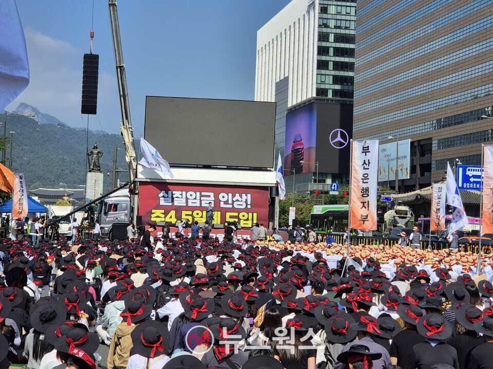 김형선 금융노조 위원장은 대회사를 통해 "2000년 주5일제를 요구하며 총파업을 벌였듯, 오늘은 주4.5일제를 위한 역사적 투쟁의 날"이라며 "주4.5일제는 가족과 함께하는 시간을 늘리고 저출산 문제 해결에도 기여할 수 있는 시대적 과제"라고 강조했다.