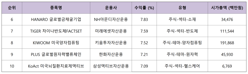 한편 상위 10개 가운데 한화자산운용이 3종으로 가장 많았다. 이어 미래에셋 2종, 신한·KB·NH아문디·키움·삼성액티브가 각각 1종씩 올렸다.
