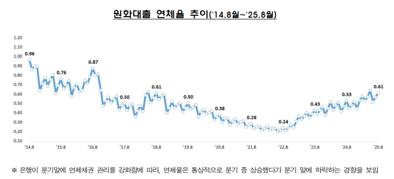 24일 금융감독원이 발표한 '2025년 8월 말 국내은행 원화대출 연체율 현황'에 따르면 국내은행의 원화대출 연체율(1개월 이상 원리금 연체 기준)은 0.61%로 집계됐다. 이는 전월 말 0.57%보다 0.04%포인트, 전년 동월 말 0.53%보다 0.08%포인트 각각 높아진 수치다.