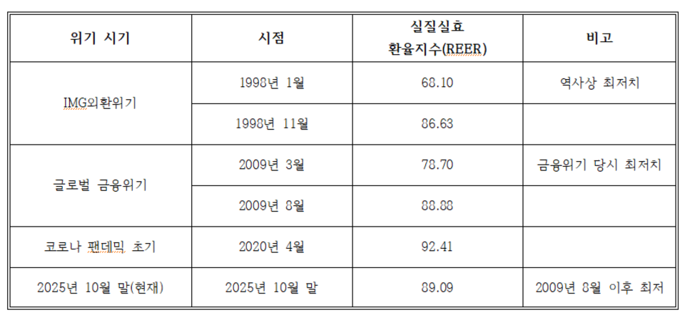 23일 한국은행에 따르면 실질실효환율지수(REER)는 10월말 89.09(2020년 100)로 한 달 만에 1.44포인트 하락하며 2009년 8월(88.88) 이후 16년 2개월 만에 최저치를 기록했다.
