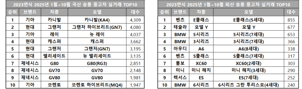 올해 1~10월 기준 2023년식 국산 중고차 중에서는 기아 카니발(KA4)이 4309대로 가장 많이 거래됐다. 이어 ▲그랜저 하이브리드(GN7) ▲뉴 레이(4037대) ▲캐스퍼(3662대) ▲그랜저 GN7(3195대) ▲뉴 펠리세이드(3135대) 등이 3000대 이상의 판매고를 올렸다.