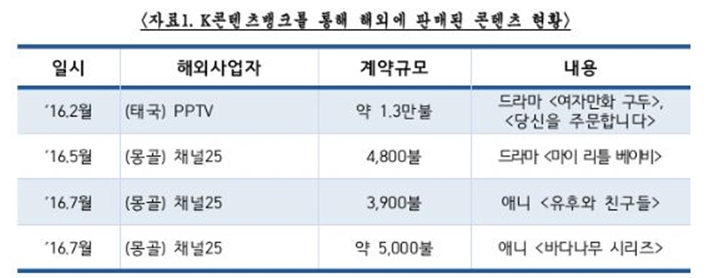 29일 국회 미래창조과학방송통신위원회 소속 윤종오 의원(무소속)이 미래창조과학부(미래부)로부터 제출받은 자료에 따르면 K콘텐츠뱅크 사업이 본격 시작된 올해 초부터 현재까지 K콘텐츠뱅크에 등록된 콘텐츠 중 단 5개의(3000만원어치)의 콘텐츠가 4건의 계약을 통해 태국과 몽골에 판매했다.