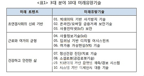 ▲빅데이터기반 사기방지 기술 ▲온라인·모바일 금융거래 보안기술 ▲사물인터넷(IoT) 보안 ▲사물정보기술(IoE) ▲딥러닝기반 디지털 어시스턴트 ▲여가용 가상현실(VR) 기술 ▲정신건강 진단·치료기술 ▲소셜로봇(공감로봇기술) ▲빅데이터기반 감염병 예측·경보 시스템 ▲시스템기반 미세먼지 대응기술 등이다.