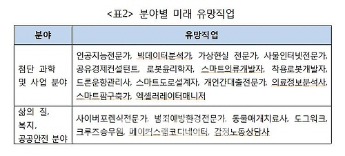 그밖에도 ▲착용로봇 개발자 ▲드론 운항 관리사 ▲스마트도로 설계자 ▲공유경제 컨설턴트 ▲사물인터넷 전문가 ▲가상현실 전문가 등 총 12개 직업이 꼽혔다.